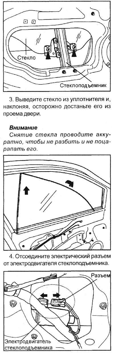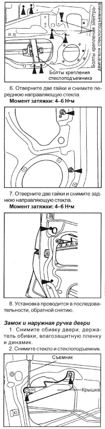 5. Отверните четыре гайки крепления стеклоподъёмника и три гайки крепления электродвигателя стеклоподъёмника и через проем во внутренней панели двери снимите стеклоподъёмник в сборе.