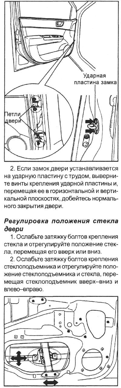 Проверьте, что дверь закрывается легко и должным образом, затем проверьте равномерность зазоров между передней и задней, верхней и нижней частями двери и кузовом. Двери и грани кузова должны быть параллельны.
