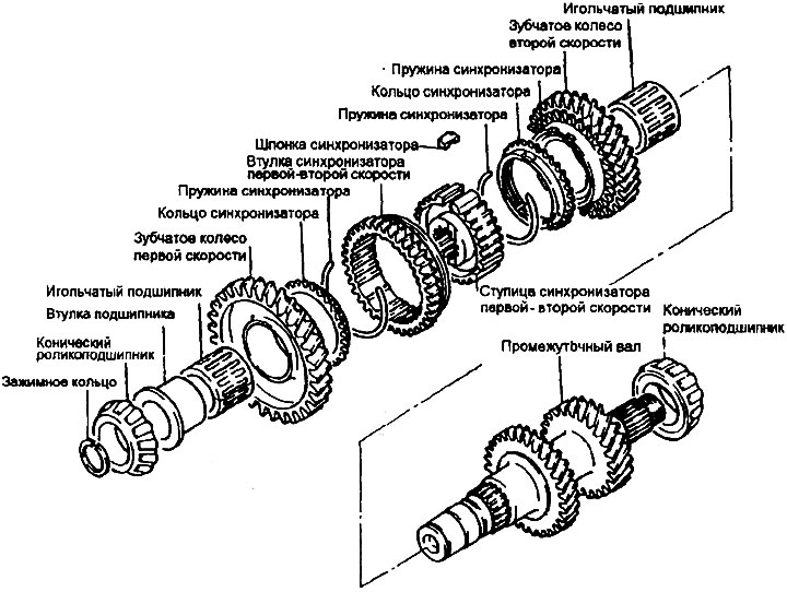 1. Проверьте зубья косозубого зубчатого колеса и муфту синхронизатора на повреждение и износ.