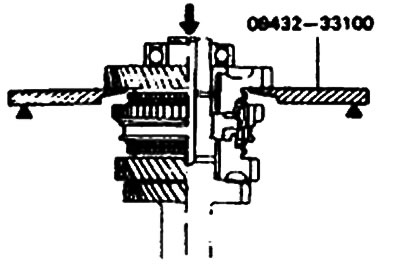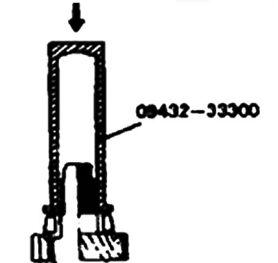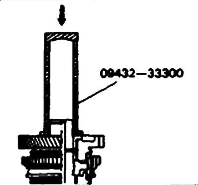7. Установите совместно игольчатый подшипник, зубчатое колесо первой передачи, втулку подшипника, применяя специальный инструмент (09432—33300), как показано на рисунке.