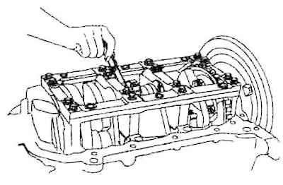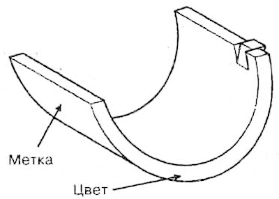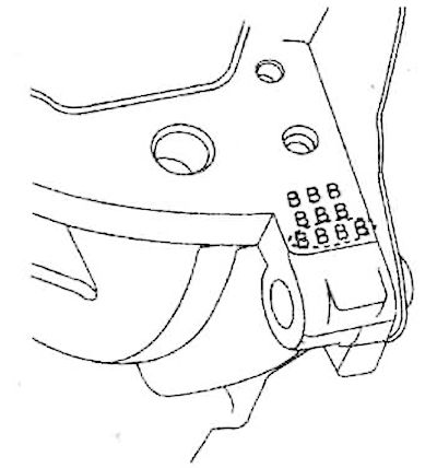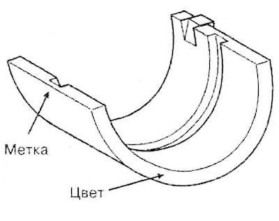 4. Буквы, выбитые на конце блока цилиндров, являются меткой размера каждой из четырех коренных опор. Использовать эти метки, а также метки на коленчатом вале для выбора шатунных вкладышей. Положение меток для подбора вкладышей коренных подшипников: