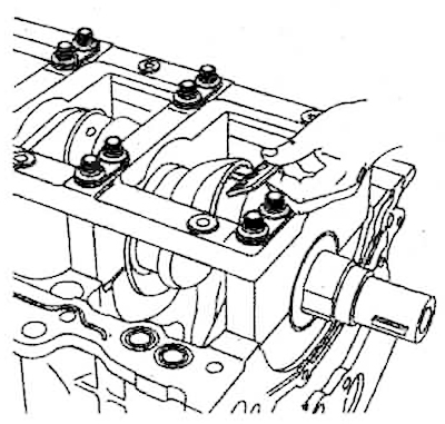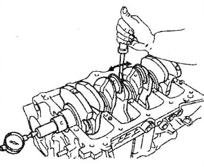 7. Используя индикатор часового типа, проверить осевой зазор коленчатого вала, перемещая его отверткой вдоль блока цилиндров. Номинальный осевой зазор: 0,07 - 0,25 мм. Предельно допустимый осевой зазор: 0,30 мм. Если величина осевого зазора превышает предельно допустимую, заменить упорные подшипники в комплекте. Толщина упорных подшипников: 2,05 - 2,09 мм.