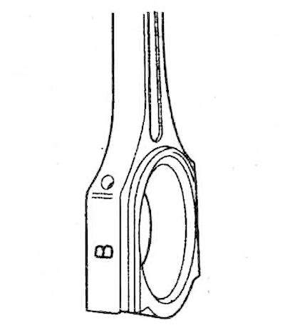 5. Если шатуны при сборке устанавливаются повторно, убедиться, что они устанавливаются в те же цилиндры, в которых они находились до разборки. Если устанавливаются новые шатуны -убедиться, что метка шатуна находится с той же стороны, что и замок вкладыша. Заменять шатун, если обнаружены любые видимые повреждения либо очевиден чрезмерный износ шатуна.