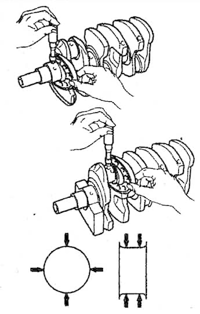 8. Микрометром измерить диаметр каждой коренной и шатунной шейки коленчатого вала в местах, указанных на рисунке стрелками. Номинальный диаметр коренных шеек: 61,982 - 62,000 мм. Номинальный диаметр шатунных шеек: 47,982 - 48,00 мм.