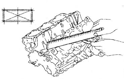 9. Скребком удалить остатки прокладки с поверхности блока цилиндров, а затем щеткой и растворителем тщательно почистить весь блок цилиндров. Используя линейку и щуп, проверить неплоскостность поверхности контакта блока цилиндров в указанных на рисунке местах. Стандартное значение не-плоскостности поверхности контакта: менее 0,03 мм. Предельно допустимая неплоскостность поверхности: 0,05 мм.