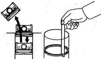 21. Для проверки зазора кольца в замке вставить кольцо в цилиндр. Установить кольцо под прямым углом к стенке цилиндра, слегка нажав на него поршнем. Проверить зазор в замке кольца щупом.