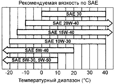 2. Вязкость моторного масла (по классификации SAE) подберите согласно диаграмме температурного диапазона, соответствующей условиям эксплуатации автомобиля.