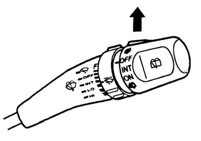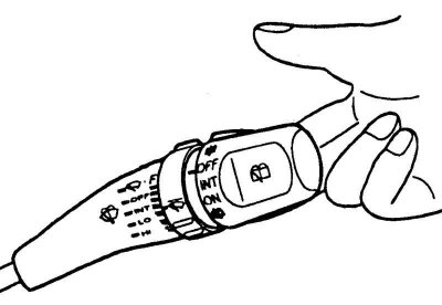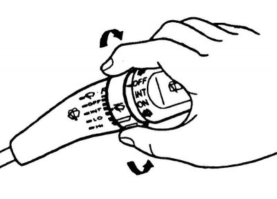 Чтобы воспользоваться режимом работы щеток стеклоочистителя с изменяемым интервалом, переместите переключатель стеклоочистителя в положение «INT» («Прерывистый режим»). В этом положении переключателя интервал прерывистого режима работы щеток стеклоочистителя может быть изменен приблизительно от 1 до 18 с путем поворота регулировочного колесика интервала прерывистого режима на рычаге переключателя.