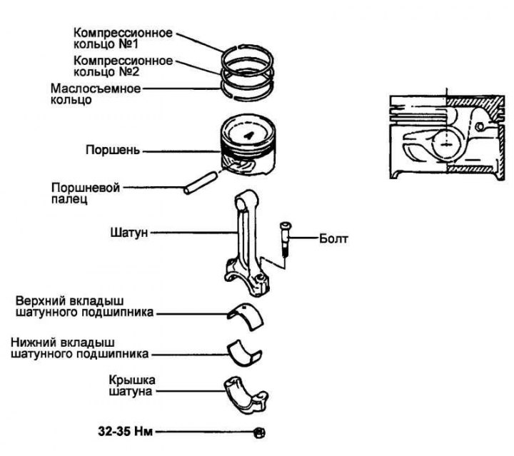 Момент затяжки гаек крепления крышек шатунов: 32–35 Н·м.
