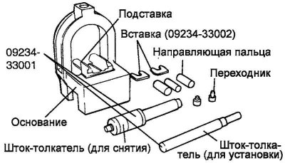 Набор специальных инструментов состоит из основания с подставкой и вставками, направляющих, переходников, штока-толкателя для снятия и штока-толкателя для установки. При снятии или установке поршневого пальца поршень удерживается на основании приспособления. Направляющие приспособления облегчают позиционирование поршневого пальца при его снятии и установке, когда шатун опирается на вставки подставки.