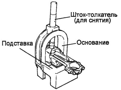 Для снятия поршневого пальца уложите поршень на основание и расположите шатун на вставке подставки. Вставьте шток-толкатель (для снятия) через дугу верхней части основания в поршневой палец и извлеките палец с помощью пресса (рис. 2.73).