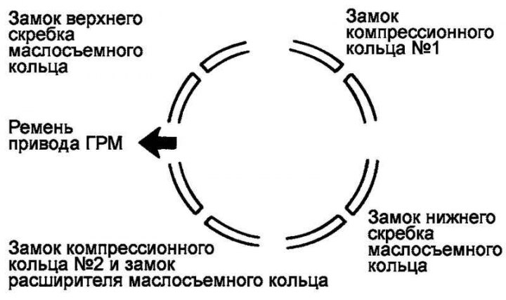 Расположите замки колец как можно дальше друг от друга. Убедитесь, что замок какого-либо кольца не находится на оси поршневого пальца или перпендикулярном данной оси направлении (рис. 2.84).