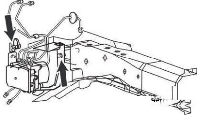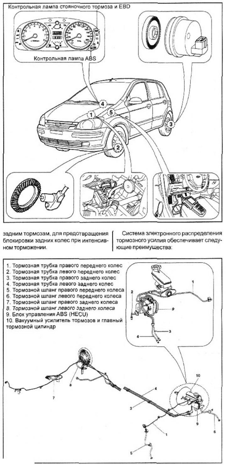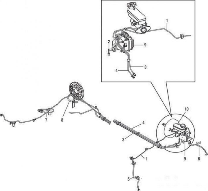 Хидраулични систем ABS: 1 – кочни цевовод десног предњег точка; 2 – кочни цевовод предњег левог точка; 3 – кочни цевовод десног задњег точка; 4 – кочни цевовод задњег левог точка; 5 – кочионо црево предњег десног точка; 6 – кочионо црево предњег левог точка; 7 – црево кочнице задњег десног точка; 8 – кочионо црево задњег левог точка; 9 – хидроелектронска управљачка јединица ABS (ГЕБУ); 10 – вакуумски појачивач кочнице и главни цилиндар