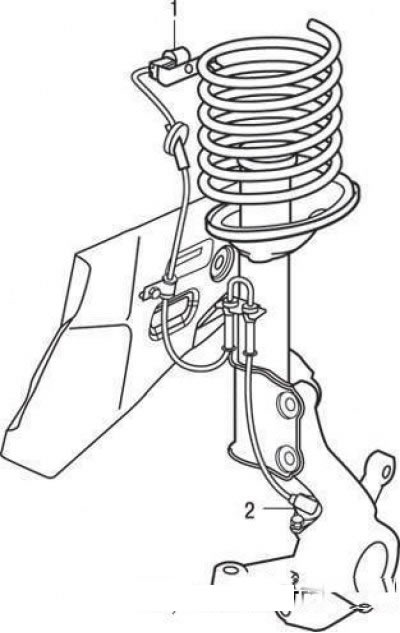 Сензор брзине предњег точка: 1 – контактни конектор сензора брзине предњег точка; 2 – сензор брзине предњег точка